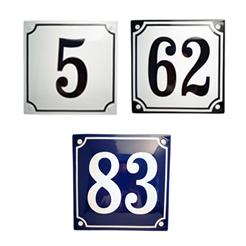 Husnummerskilt i ekte emalje. Ekte emalje er smeltet glassmasse, og må ikke forvekslet med skilt malt med en emaljelakk.